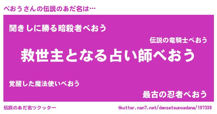 | 男性向けラノベタイトル風あだ名 | 『Re:べおうから始める異世界生活』 |