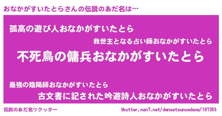 | ヒーロー風カッコイイあだ名 | 『スーパーオナカガスイタトラ』 |