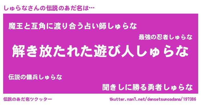 | 意味不明あだ名 | 『とにかく怪しいしゅらな』 |