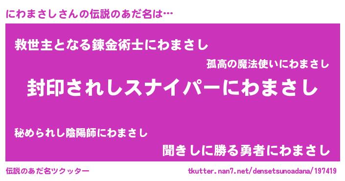 | 胡散臭い通販商品みたいなあだ名 | 『億万長者になれる霊験あらたかなお札…その名も「にわまさし」』 |