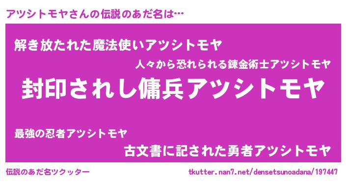 | 男性向けラノベタイトル風あだ名 | 『アツシトモヤアートオンライン』 |