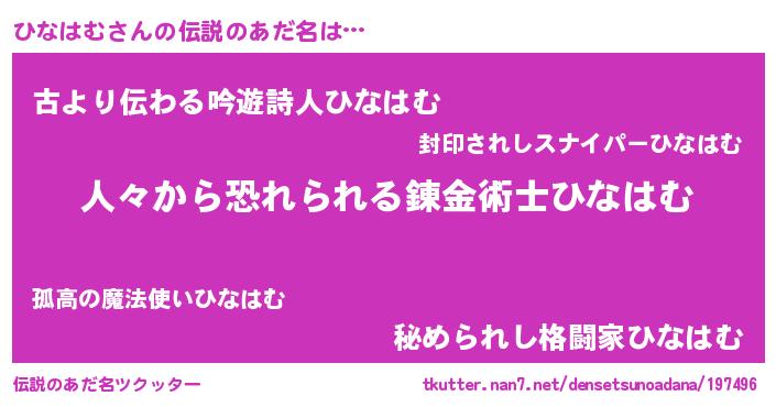 | 男性向けラノベタイトル風あだ名 | 『おまえをオタクにしてやるから、俺をひなはむにしてくれ! 』 |