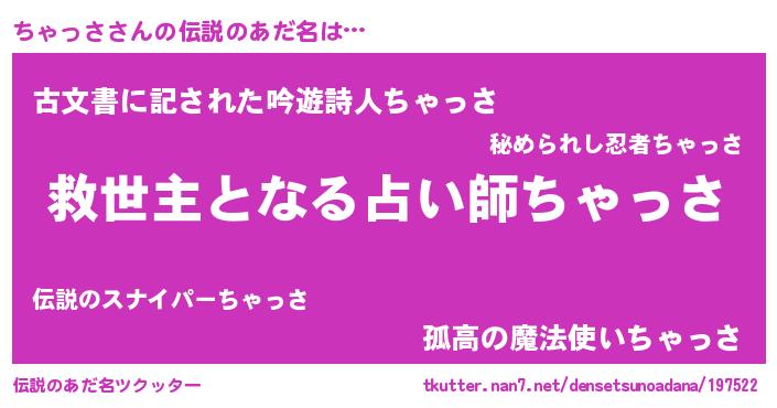 | ヒーロー風カッコイイあだ名 | 『天空の使者ちゃっさ』『ネオチャッサ』 |