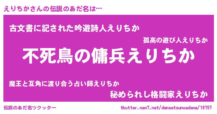 | 男性向けラノベタイトル風あだ名 | 『えりちかの憂鬱』『魔弾の王とえりちか』 |