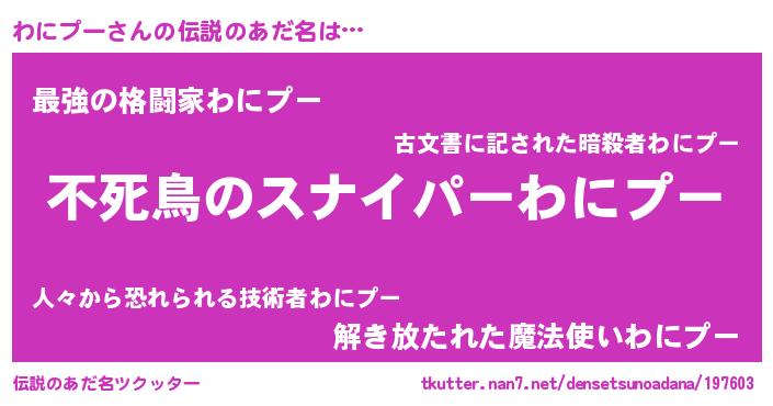 | 女子向けラノベタイトル風あだ名 | 『わにプー姫と円卓の騎士』 |