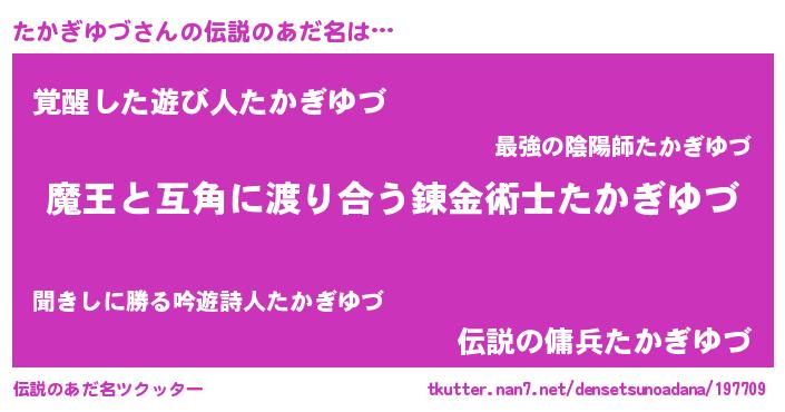 | ヒーロー風カッコイイあだ名 | 『仮面タカダー』『究極戦士タカギユヅ』 |