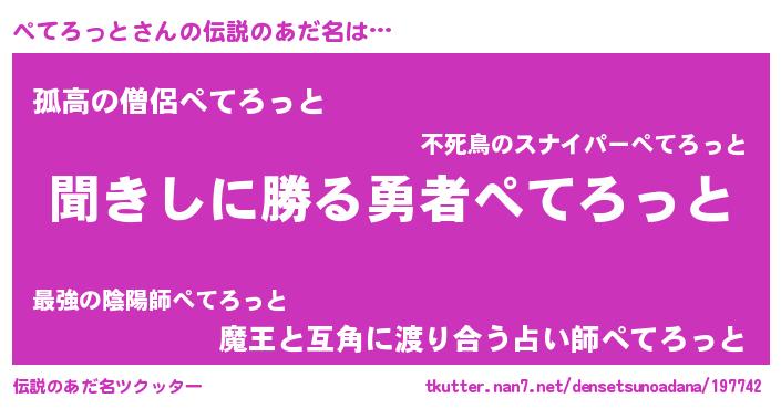 | 男性向けラノベタイトル風あだ名 | 『ぺてろっとという概念が存在しない退屈な世界 』 |