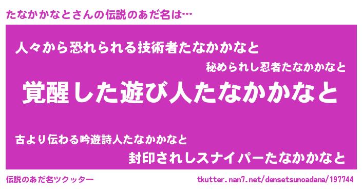 | 男性向けラノベタイトル風あだ名 | 『この素晴らしい世界にたなかかなとを!』 |