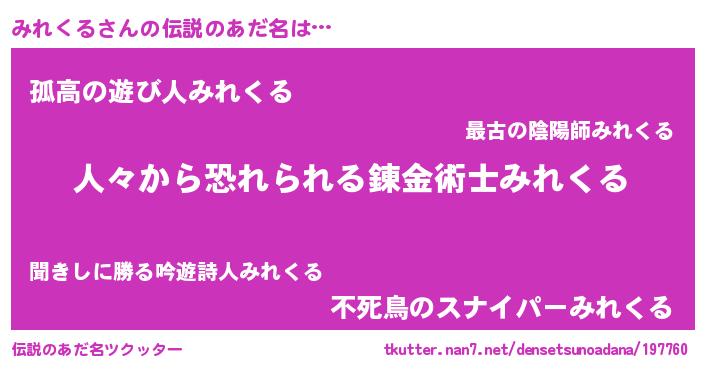 | 意味不明あだ名 | 『住所不定無職みれくる(85歳)』 |
