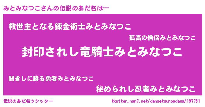 | 男性向けラノベタイトル風あだ名 | 『みとみなつこ~年齢イコール彼女いない歴の魔法使い~』 |