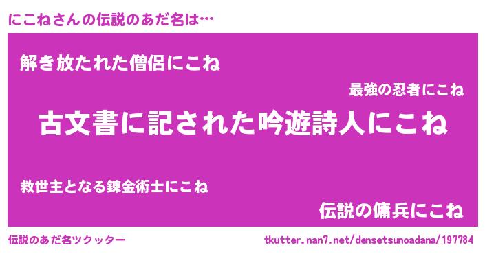 | 男性向けラノベタイトル風あだ名 | 『にこね~年齢イコール彼女いない歴の魔法使い~』 |