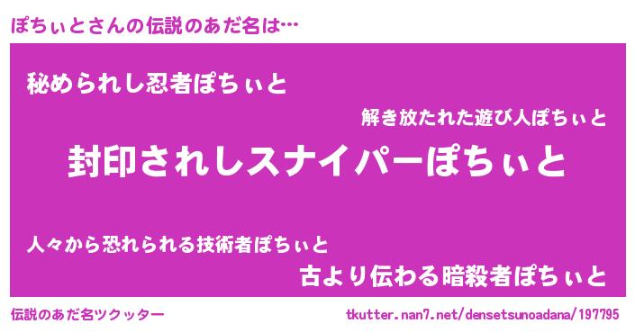 | 胡散臭い通販商品みたいなあだ名 | 『あなたにだけ特別に提供する世界で10本だけ現存している希少なブランデー…その名も「ぽちぃと」』 |