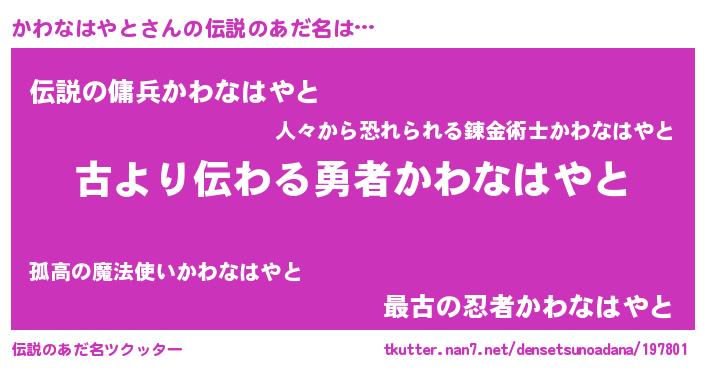| ヒーロー風カッコイイあだ名 | 『ネオカワナハヤト』『黄金騎士カワ』 |