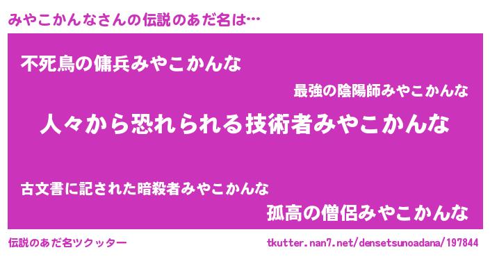 | 男性向けラノベタイトル風あだ名 | 『おまえをオタクにしてやるから、俺をみやこかんなにしてくれ! 』 |
