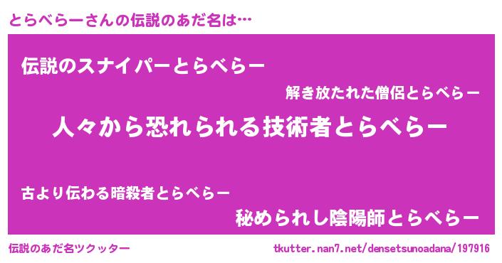 | 男性向けラノベタイトル風あだ名 | 『魔弾の王ととらべらー』 |