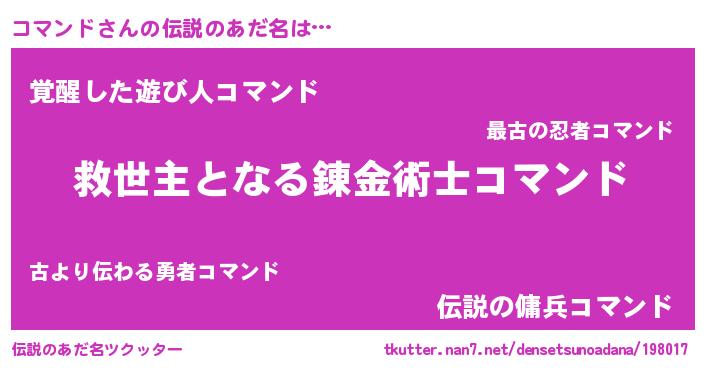 | 女子向けラノベタイトル風あだ名 | 『死神コマンドの再婚』『闇のコマンド』 |