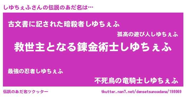 | ヒーロー風カッコイイあだ名 | 『究極戦士シユチェフ』『仮面シユダー』 |