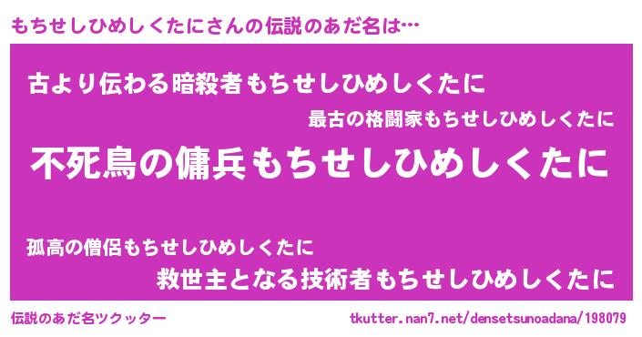 | 女子向けラノベタイトル風あだ名 | 『もちせしひめしくたに姫と円卓の騎士』 |