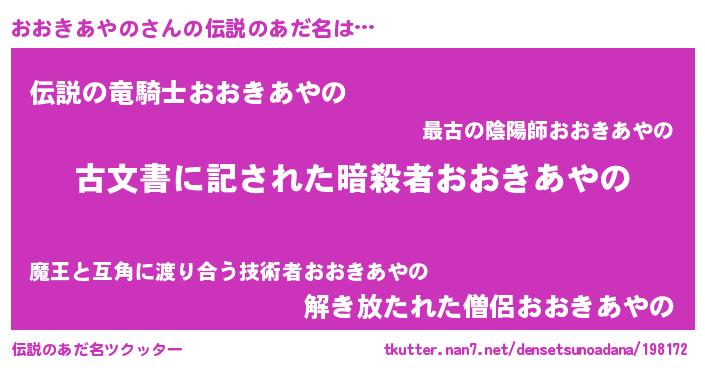 | 男性向けラノベタイトル風あだ名 | 『おおきあやの~年齢イコール彼女いない歴の魔法使い~』 |