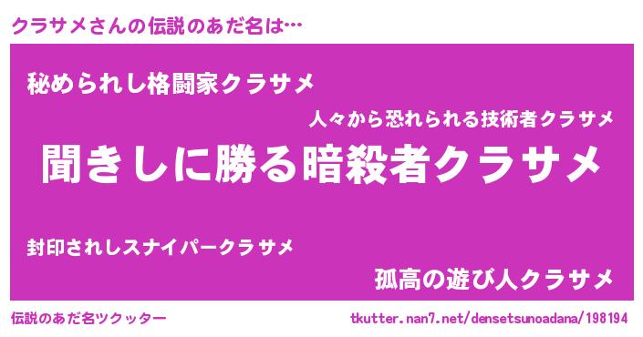 | 意味不明あだ名 | 『永久保存クラサメ』『自称クラサメ』 |