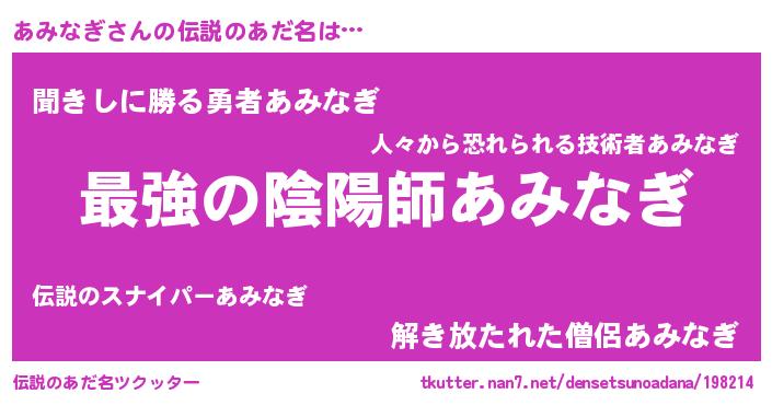 | 男性向けラノベタイトル風あだ名 | 『Re:あみなぎから始める異世界生活』 |