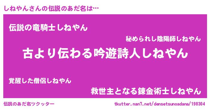 | 意味不明あだ名 | 『永久保存しねやん』『自称しねやん』 |