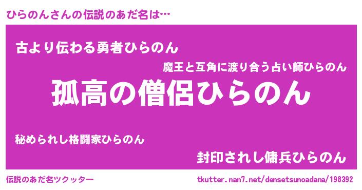 | ヒーロー風カッコイイあだ名 | 『超時空戦士ヒラノン』『幻影騎士ヒラ』 |