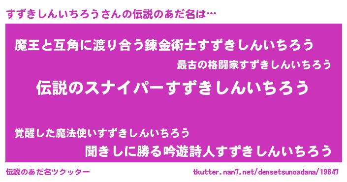 | 男性向けラノベタイトル風あだ名 | 『スズキシンイチロウスレイヤー』 |