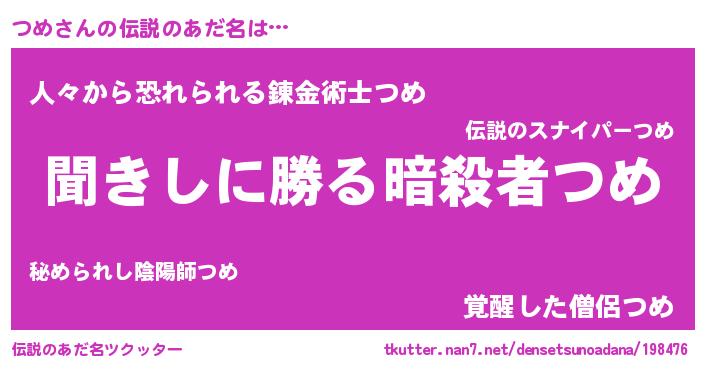 | 意味不明あだ名 | 『住所不定無職つめ(62歳)』『永久保存つめ』 |
