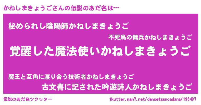 | 男性向けラノベタイトル風あだ名 | 『かねしまきょうごの嫁は女の子じゃないと思った?』 |