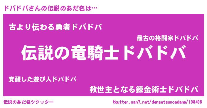 | 男性向けラノベタイトル風あだ名 | 『ドバドバの憂鬱』『魔弾の王とドバドバ』 |