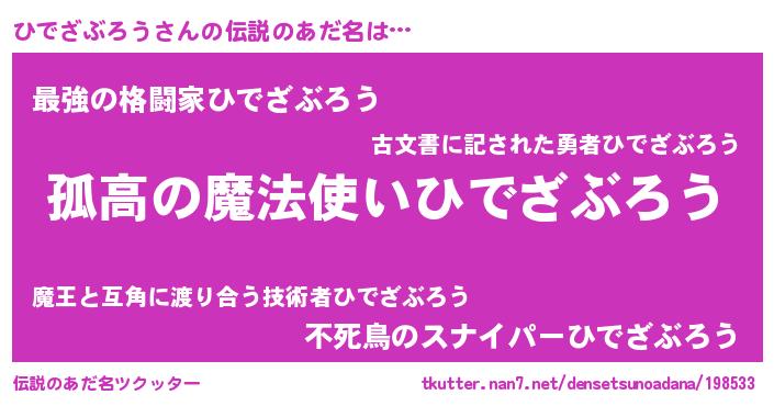 | 男性向けラノベタイトル風あだ名 | 『魔弾の王とひでざぶろう』 |