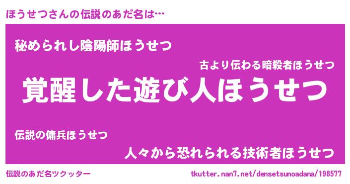 | 男性向けラノベタイトル風あだ名 | 『ほうせつ~年齢イコール彼女いない歴の魔法使い~』 |