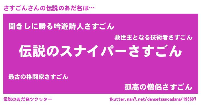 | 男性向けラノベタイトル風あだ名 | 『サスゴンスレイヤー』『さすごんの憂鬱』 |