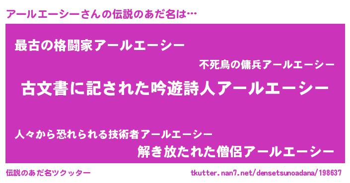 | ヒーロー風カッコイイあだ名 | 『ネオアールエーシー』『魔戒騎士アー』 |
