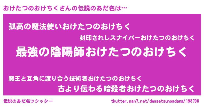 | 男性向けラノベタイトル風あだ名 | 『この素晴らしい世界におけたつのおけちくを!』 |