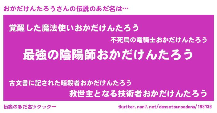 | 男性向けラノベタイトル風あだ名 | 『うちのおかだけんたろうが世界を掌握している!』 |