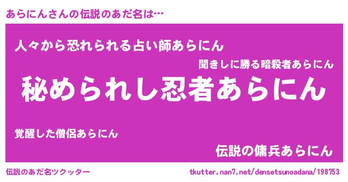 | ヘコむあだ名 | 『つくし』『あらにゅー』『あらっぺ』 |