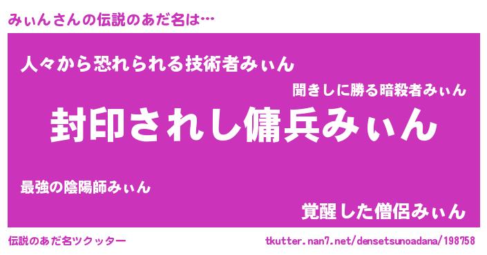 | ヒーロー風カッコイイあだ名 | 『スーパーミィン』『正義の使者みぃん』 |