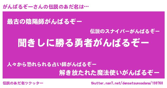 | 男性向けラノベタイトル風あだ名 | 『ガンバルゾースレイヤー』 |