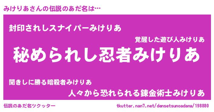 | 意味不明あだ名 | 『住所不定無職みけりあ(47歳)』 |