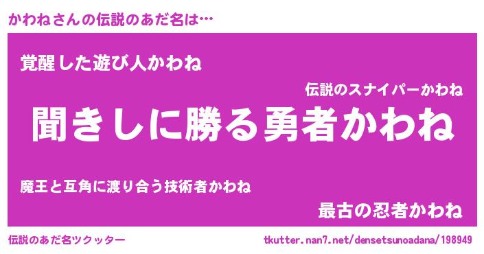| ヒーロー風カッコイイあだ名 | 『ネオカワネ』『黄金騎士カワ』 |
