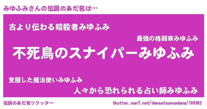 男性向けラノベタイトル風あだ名 | 『魔弾の王とみゆふみ』『みゆふみの憂鬱』 |