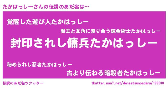 | ヒーロー風カッコイイあだ名 | 『スーパータカハッシー』『炎刃騎士タカ』 |