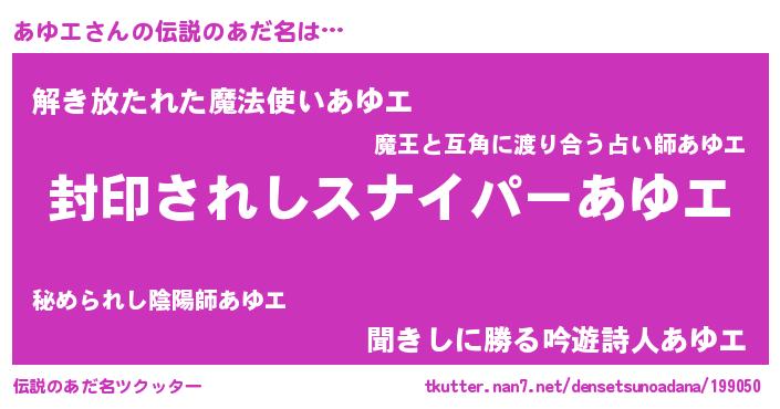 | 胡散臭い通販商品みたいなあだ名 | 『億万長者になれる霊験あらたかなお札…その名も「あゆエ」』 |