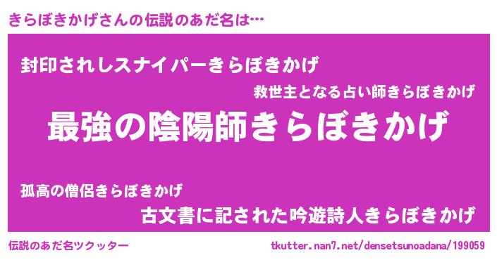 | 男性向けラノベタイトル風あだ名 | 『Re:きらぼきかげから始める異世界生活』 |