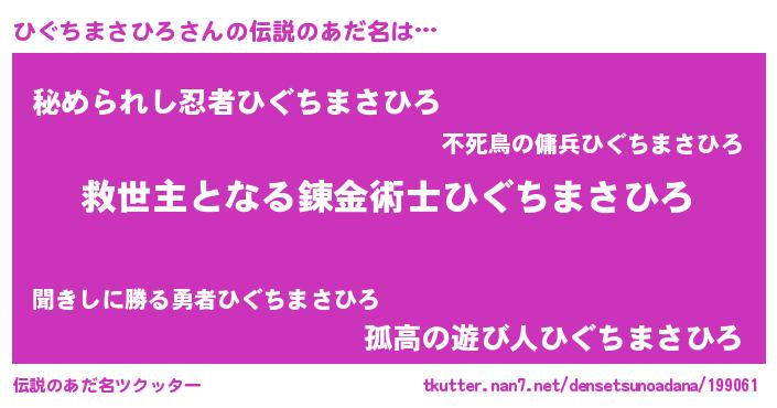 | 男性向けラノベタイトル風あだ名 | 『うちのひぐちまさひろが世界を掌握している!』 |