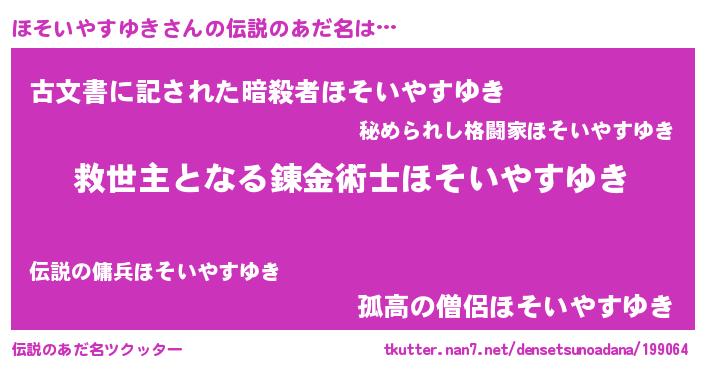 | 男性向けラノベタイトル風あだ名 | 『この素晴らしい世界にほそいやすゆきを!』 |