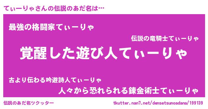 | 男性向けラノベタイトル風あだ名 | 『てぃーりゃの嫁は女の子じゃないと思った?』 |
