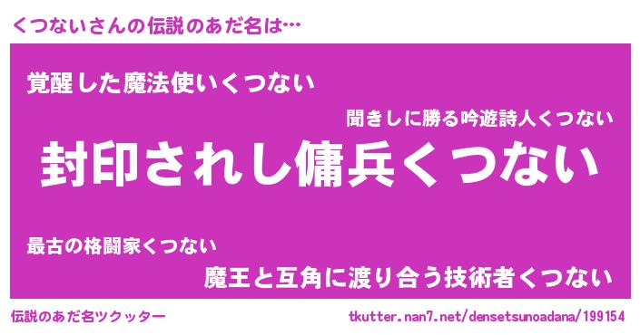 | 男性向けラノベタイトル風あだ名 | 『くつない~年齢イコール彼女いない歴の魔法使い~』 |